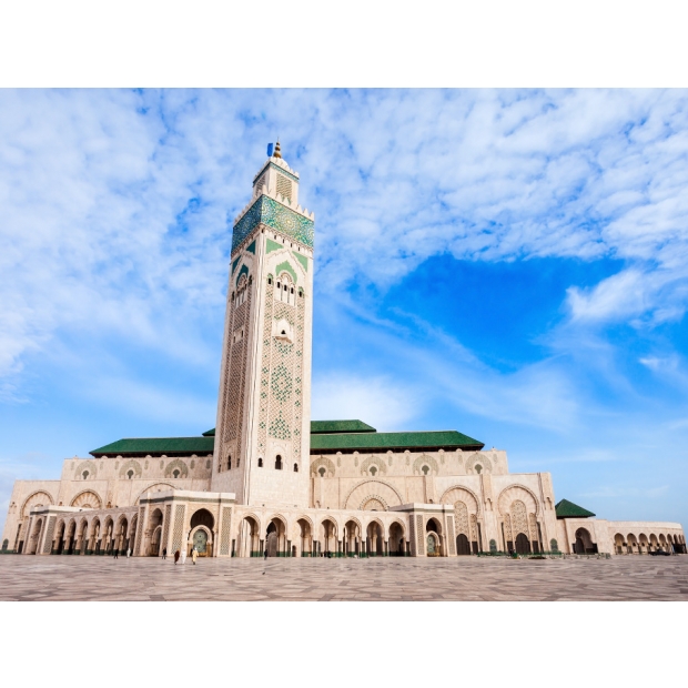 卡薩布蘭卡是摩洛哥最大城市與經濟重鎮,不僅交通便利,也是摩洛哥最具現代化的代表城市。這座臨海城市融合法式殖民風格與伊斯蘭傳統建築,形成獨特城市輪廓。最引人注目的地標,是坐落在大西洋岸邊的哈桑二世清真寺(Hassan II Mosque),其宣禮塔高達 210 公尺,是全球最高的清真寺宣禮塔之一。清真寺部分懸空於海面之上,地毯、雕刻與馬賽克工藝極為細膩,非穆斯林亦可入內參觀,是了解伊斯蘭建築藝術的珍貴機會。城市中亦有不少精品街區與咖啡館,展現歐洲風情與當代生活節奏,與摩洛哥其他城市迥異。卡薩布蘭卡不只是一座電影裡的名字,更是一個能從傳統走入未來的城市視窗,為摩洛哥之旅畫下現代與歷史交融的深刻句點。