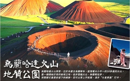 【烏蘭哈達火山地質公園】烏蘭哈達火山草原,位於內蒙古烏蘭察布,座落著大小不一的30多座的火山, 是一個隱秘於世的秘境之地。徒步登臨火山,無壓輕徒步,用雙腳丈量歷史留下的痕跡。您可以穿上宇航 服,漫步“火星表面”打卡。
