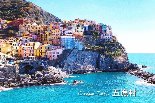 【五漁村】五漁村又稱五鄉地,五個漁村從北到南分別為蒙特羅索、韋爾納扎、科爾尼利亞、馬納羅拉及里奧馬焦雷,以海岸旁陡峭山壁、梯田及色彩繽紛依山壁而建的房舍景觀聞名。1997 年被聯合國教科文組織列入世界文化遺產名錄,1999 年義大利將五漁村正式納為國家公園,是義大利面積最小的一座國家公園。安排搭乘※當地區間火車來往於村落之間,可欣賞到在懸崖峭壁的綿延海岸線及山谷有許多色彩繽紛的房舍,斜坡上綠意盎然的葡萄園,景色宜人,令人心曠神怡
