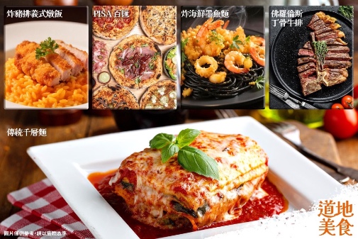 燉飯+炸豬排/披薩吃到飽/墨魚麵+炸海鮮/佛羅倫斯丁骨牛排/傳統義式千層麵,義大利一直以來就是地中海料理的天堂,美味的橄欖油盛產故鄉,氣候溫和,蔬果,漁產,肉類豐盛,從羅馬帝國時代,就深刻的影響歐洲的美食版圖,來到義大利,必須滿足味蕾的享受。
