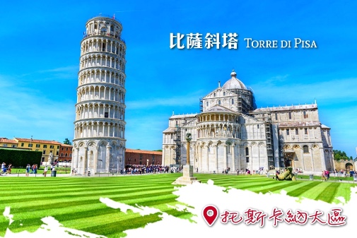 【比薩斜塔】在一片寬闊的草坪上,坐落著比薩大教堂廣場。廣場上有一組舉世聞名的紀念建築群:大教堂、洗禮室、鐘樓(即比薩斜塔)和墓地。這四件中世紀時的建築傑作對義大利 11 世紀到 14 世紀間的紀念建築藝術產生了極大影響。