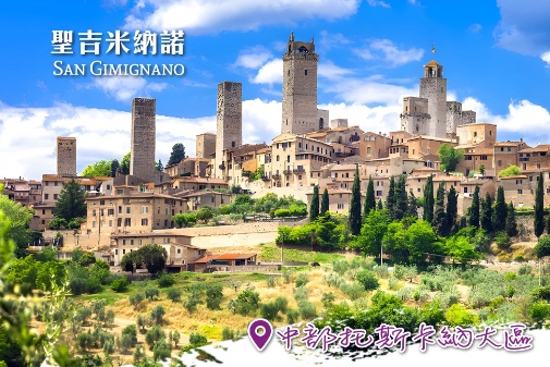 【聖吉米納諾】有百塔之城美稱,位於西思納北方,從中古世紀即建城,又名「塔之都」。過去是教皇派與帝王派侵略爭奪、地方豪族權力鬥爭之下,古代居民常於塔上以石塊丟擲敵人,替貴族們擔任守護城堡的任務,因此塔築得越高,越顯示其權力及尊貴。原本70多座高塔,現僅存13座。在聖吉米納諾的舊市區中心,有一座13世紀的古井,四周盡是13、14世紀黃色石灰岩所建的豪宅。