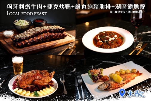 ✿多國在地美食饗宴、匈牙利燉牛肉+紅酒一杯、捷克烤鴨+啤酒一杯、維也納豬肋排、湖區鱒魚餐。