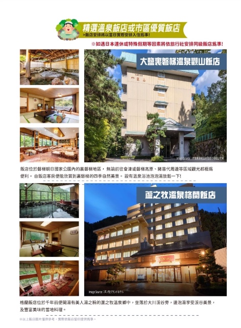 早餐:飯店內享用 午餐:地元特色料理 晚餐:日式風味餐或 飯店內自助餐或御膳料理 住宿:山形 ROUTE INN飯店 或格蘭飯店 或天童溫泉黑田景觀飯店 或作並溫泉 或同級 【東光酒藏】是東北最大規模的酒造資料館,館內還設置彷彿穿越時空回到明治時代酒窖的空間,別有風情。寬廣且韻味十足的釀造倉,也以電影及海外知名化妝品的廣告取景地聞名。此外酒窖的主棟部分以完全不使用鋼釘的傳統工法所建,是現代技術難以重現的歷史性建築。 【銀山溫泉】與宮城縣鄰接的山形縣尾花澤市內有一座沿著銀山川溪谷的銀山溫泉,銀山川清冽的河水冒著熱氣穿流其中,這裏有成排的 3、4層樓木結構的旅館,氣氛寧靜,宛如世外桃源。500多年前這裏發現了銀礦,所以這座溫泉村取名爲「銀山」,人們來到這裏總會産生一種錯覺,以爲到了拍攝日本古代戲的電影村。溫泉街的前端是白銀公園,有一條長長的散步小道,這是洗完溫泉澡後最理想的散步去處,入口處有一個落差22米的白銀瀑布,上流有籟音瀑和河床由整塊岩石構成的洗心峽(文殊谷),還有延澤銀礦坑,坑道內有照明,進出約需30分鐘,遊人在這裏可以體驗一下洞窟探險的樂趣。銀山溫泉最出名的景色,就是冬季來臨之際,東北地區的地面覆蓋上層層白雪,點綴在古老的溫泉街區,昏黃的煤氣燈映照著川流兩岸,形成難以忘懷的夢幻畫面。除此之外,兩旁大正浪漫時期的溫泉旅館,以及銀山溫泉悠久的歷史,也是令人留連忘返的原因。 ※備註說明:銀山溫泉因實施時段人數管制公告,實施期間為12月初至2026年03月底(詳見官網公告),如遇時段預約額滿或其他不可抗力因素之影響導致無法前往,將改往奧州三大名湯~飯坂溫泉街散策,敬請見諒!
