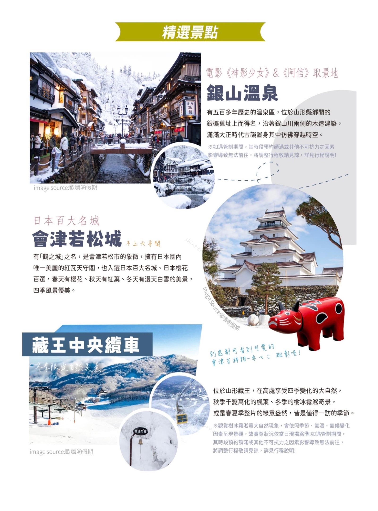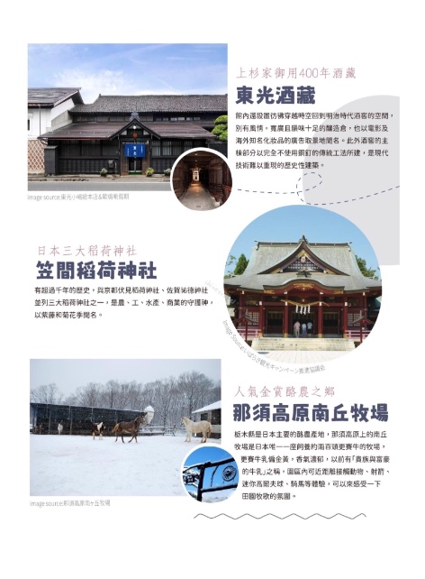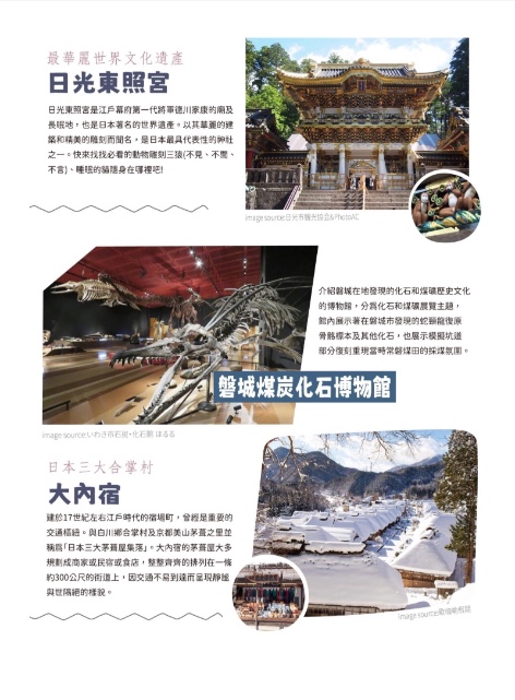 (藏王中央纜車、銀山溫泉街、大內宿、日光東照宮、那須高原南丘牧場、東光酒藏)