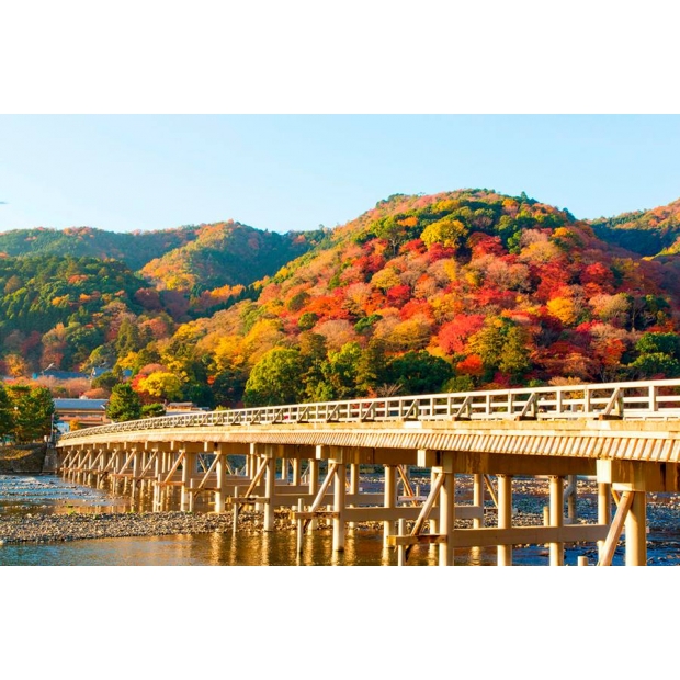 京都最具代表性的觀光名勝「嵐山渡月橋」,四季之春櫻、夏綠、秋楓、冬雪遊人均絡繹不絕,橋下的桂川波光粼粼,水鳥點綴其間,彷若人間仙境!自平安朝起,日本的貴族們就將這一帶做為郊外踏青,泛舟戲水的遊樂地。渡月橋附近景色宜人,青山綠水,料亭紅燈,遊人如織。沿河可偶見盛裝藝妓姍姍而行,風情萬種。
