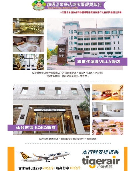 持中華民國護照進入日本為免簽證。但護照需在回國日當日起算有效期六個月以上。 若您是現役軍人身份,出國必須蓋兩種章: 若您是役男者,出國前必須前往戶籍所在地之鄉鎮市區公所兵役科(課)蓋兩種章: 雙重國籍者,進出中華民國國境,須使用同一本護照進、出國境。役男是指年滿十九歲當年一月一日起至年滿三十六歲當年十二月三十一日止尚未履行兵役義務之男子。 本行程所載之簽證相關規定,對象均為持中華民國護照之旅客,若貴客持他國護照,請先自行查明相關規定,報名時並請告知您的服務人員。 移民署相關規定,注意事項第5點。 【費用說明】 費用包含: 1、台灣/日本來回經濟艙包機團體機票一張。 2、兩地機場稅、燃油附加稅、雜支服務費、行李20公斤及手提行李10公斤。 3、優質飯店住宿二人一室及全程列表餐食。 4、行程所列之旅遊交通費用、門票入場費。 5、履約責任險新台幣8400萬元。 6、本行程旅遊責任意外險及旅遊意外醫療險依法令規定金額投保。 7、此報價已經分攤65歲以上老人與小孩的優惠票價差,如產生恕不退還優惠票價差。 1、行程表上未表明之各項開支,自選建議行程交通及應付費用。 2、純係私人之消費:如行李超重費、飲料酒類、洗衣、電話、電報及私人交通費。 3、個人護照新辦之辦理費用NT$1,800/人。 4、若無法安排室友或指定住宿單人者,須補單人房價差,詳情請洽當團業務。 5、導遊、領隊、司機人員小費每日NT$300 /人(參加日本團NT$300X5日= NT$1,500/人) 。 【特別說明】 1、此行程需16人以上方達出團人數,如人數不足無法出團將於出發前七天通知。 2、每位團員訂金NT$15,000元整。(※提醒您:當您繳付訂金即表示旅遊契約產生效力,本公司將依各協力商之要求,為您預付此趟旅程的旅館、餐廳或機票等費用。若您因故取消,本公司將依「國外旅遊定型化契約書」之相關條款或估算已實付的費用,向您收取超支費用或退回剩餘訂金。) 3、團費報價以雙人房(2人一室)為準,歡迎您結伴參加。單人者報名,需補全程單人房型價差,該金額請洽當團業務,原則上我們會協助安排同性別團員共用一室,若能安排兩人一室則免收單人房差額。(單人房差係指「單人指定入住一間房之價差」)。 4、國際觀光旅館房間以雙人房2張單人床為基準房型,如遇特殊房型需求(大床房型、三人房),請事先提出需求,但無保證一定有此房型;大部份飯店無三張正常床型之三人房,也無法提供雙人房加床,如旅客需求三人同住一房,全球飯店幾乎都以統一型式之折疊床為加床,加床後室內空間變小。基於房型與消防理由,最多僅能加一張床,或無法加床,敬請了解見諒。如無法接受此安排,建議勿需求三人同住一房;若遇部分飯店無法提供加床服務,則請補單人房差,或與其他團員同房住宿,敬請見諒。 5、素食者;因各地風俗民情不同,國外的素食習慣大多是可以食用蔥、薑、蒜、蛋、奶等,除華僑開設的中華料理餐廳外,多數僅能以蔬菜、豆腐等食材料理為主;若為 飯店內用餐或一般餐廳使用自助餐,亦多數以蔬菜、漬物、水果等佐以白飯或麵食類。故敬告素食貴賓,海外團體素食餐之安排,無法如同在台灣般豐富且多變化,故建議素食貴賓能見諒安排不易或自行準備符合口味及方便攜帶的副食品、點心備用,如餅乾、泡麵..等,以備不時之需。 6、行程順序若因特殊狀況及其他不可抗力之現象,如:天候、交通、航班、船舶影響,而有飯店、景點、餐食順序上之調動,本公司保留變更或調整行程之權利。 7、如因個人因素無法成行,已繳付之團體費用恕無法退還。 8、因飛行安全考量及法規限制,台灣虎航規範每航班嬰兒人數上限為10名。如欲攜帶2歲以下嬰兒同行(以參加之行程返國日計算),煩請提供嬰兒及同行者名單,待服務人員與台灣虎航回覆預訂OK後,方完成訂位。嬰兒訂位將以入名單先後順序受理,額滿即不再接受,敬請留意。 9、團體機票使用限制:※為免爭議,敬請於購買前詳細閱讀。 a.團體行程使用團體來回經濟艙機票,需「團進團出」,一經開票不可延回、不得退票及延期使用。 b.團體行程使用之票種為團體機票,機票無法累積航空公司哩程數、不可事先指定座位或劃位。(航空公司依照乘客之英文姓名之字母先後順序作訂位紀錄以及機上座位排序。) c.為響應環保及考量作業之便捷,本行程將以電子機票取代紙本票根列印。如欲取得搭機證明,請於搭機後盡速向業務提出申請;另需加收手續費100元(單程)。 11、如航班為(加)包機,航班時間為暫定時間,正確起降時刻請以說明會資料為準;將依兩國政府及航空公司公佈為準。若有調整,本公司將保有行程前後順序調整之權。亦盡全力維持原行程之規劃,調度考量恕無法退費及取消。 12、因全球氣候異變、自然生態難以準確評估,開花週期亦無法掌握,遇天候因素(下雨、颱風、氣溫...)難保證開放的程度,其凋謝或未綻開會依往原景點純欣賞,敬請貴賓於報名前自行斟酌衡量,並請見諒,謝謝您。 ★【特別說明】日本國土交通省於平成24年6月(2012年)發布最新規定,每日行車時間不得超過10小時(以自車庫實際發車時間為計算基準),以有效防止巴士司機因過(疲)勞駕駛所衍生之交通狀況。(資料來源:日本國土交通省)