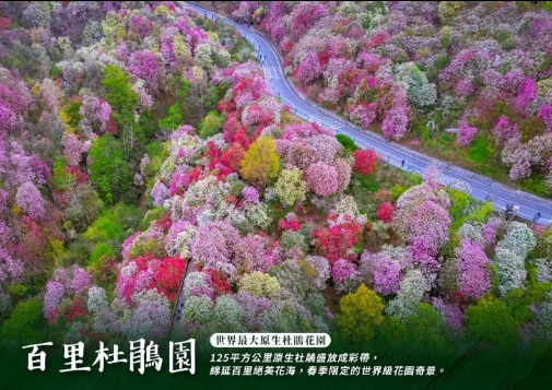 百里杜鵑實為一座規模宏偉的天然花園,以天然的杜鵑花海而得名。又因以 大面積原生杜鵑林為主要特色,杜鵑林帶寬1~3千米,綿延50餘千米,綿延百里,故稱“百里杜 鵑”。被譽為“世界上最大的天然花園”,享有“地球綵帶、世界花園”之美譽。※備註:每年的3月底-4月是百里杜鵑風景名勝區的最佳花期,也是最適合參觀的時間節點。因開花時 間屬自然現象,無法預測,各地區的花期不同,也會因氣候的冷熱會影響花期的提前或延後,如因天候等 不可抗拒之因素,導致出發時無法欣賞到全盛之花期,敬請諒解!