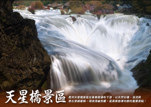 【天星橋風景區】位於黃果樹大瀑布下游7公里處。這裡主要觀賞石、樹、水的美妙結合,是水上石林 變化而成的天然盆景區。如果說黃果樹大瀑布的特點是氣勢磅礡,天星橋區則是玲瓏秀美。