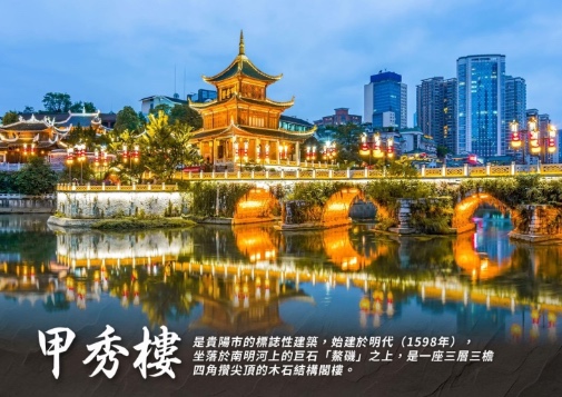 【甲秀樓】始建於明萬曆26年,也就是1598年,時任撫江東之於此築堤聯結南岸,並建一樓以培風水, 名曰”甲秀”,取”科甲挺秀”人才輩出之意。至今已有400多年歷史,從古到今該樓經歷了六次大規 模的修葺。歷經四百年的風吹雨打而仍舊矗立不倒,是貴陽歷史的見證,是貴陽地標性建築。樓高約 20米,為三層三簷攢尖頂,這種構造在中國古建築史上都是獨一無二的。畫甍翹簷,紅欞雕窗,白石 巨柱托簷,雕花石欄相護,華麗宏偉。12根石柱托簷,護以白色雕塑花石欄杆,翹然挺立,煙窗水 嶼,如在畫中。登樓遠眺,四周景致,歷歷在目。