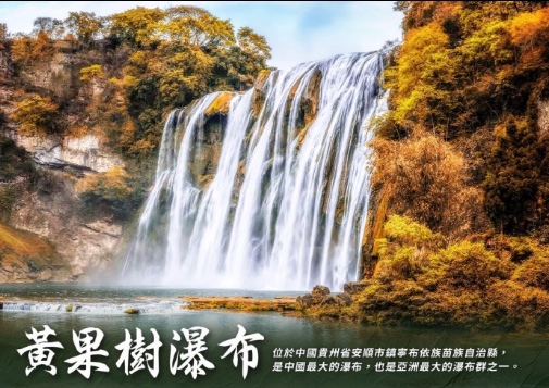 【黃果樹瀑布景區】位於中國貴州省安順市鎮寧布依族苗族自治縣,是珠江水系打邦河的支流白水河 九級瀑布群中規模最大的一級瀑布,古稱白水河瀑布,亦名“黃葛墅”瀑布或“黃桷樹”瀑布,因本 地廣泛分佈著“黃葛榕”而得名,是世界著名大瀑布之一。以水勢浩大著稱。瀑布高度為77.8米,其 中主瀑高67米;瀑布寬101米,其中主瀑頂寬83.3米。黃果樹瀑布屬喀斯特地貌中的侵蝕裂典型瀑布。 景區以黃果樹瀑布為中心, 有地面有18個瀑布,地表下有14個瀑布。黃果樹瀑布是亞洲最大的瀑布。 黃果樹瀑布最奇特的地方是在瀑布背後隱藏著一條百公尺長的水濂洞、洞中除了觀賞千奇百怪的鐘乳 石、更可置身洞中觀賞瀑布、令您此生難忘。