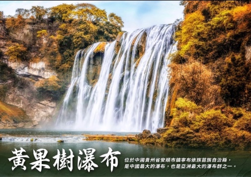【黃果樹瀑布景區】位於中國貴州省安順市鎮寧布依族苗族自治縣,是珠江水系打邦河的支流白水河 九級瀑布群中規模最大的一級瀑布,古稱白水河瀑布,亦名“黃葛墅”瀑布或“黃桷樹”瀑布,因本 地廣泛分佈著“黃葛榕”而得名,是世界著名大瀑布之一。以水勢浩大著稱。瀑布高度為77.8米,其 中主瀑高67米;瀑布寬101米,其中主瀑頂寬83.3米。黃果樹瀑布屬喀斯特地貌中的侵蝕裂典型瀑布。 景區以黃果樹瀑布為中心, 有地面有18個瀑布,地表下有14個瀑布。黃果樹瀑布是亞洲最大的瀑布。 黃果樹瀑布最奇特的地方是在瀑布背後隱藏著一條百公尺長的水濂洞、洞中除了觀賞千奇百怪的鐘乳 石、更可置身洞中觀賞瀑布、令您此生難忘。