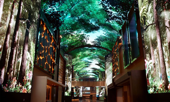 【Mohegan INSPIRE(LED數位大道)】位於韓國仁川永宗島的「迎仕柏度假城」,該度假城毗鄰仁川國際機場,是一個大型綜合娛樂度假城,提供最奢華的度假遊樂設施、水上樂園、飯店客房和餐廳等設施。其中的「極光道」配備了一個長達150米的LED螢幕,定時播放3D動畫,讓遊客身歷其境。