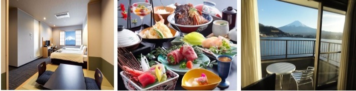 富士山五湖温泉飯店~~坐落於距離富士山最近的湖泊「富士五湖」的湖畔,設有露天溫泉和日式的大 浴場,並準備了美味的料理以療癒旅行的疲累。五湖呈新月狀分佈於富士北麓。各湖岸邊皆有日式旅館 和酒店,可以一邊泡溫泉一邊觀賞富士山景色的變化,透過朦朧的水汽凝望天賜的富士山巔,料想這世 間怕是沒有比得上此處的地方了。