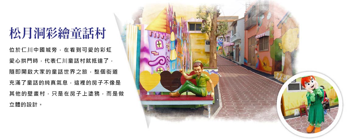 【松月洞彩繪童話村】位於仁川中國城旁,在看到可愛的彩虹愛心拱門時,代表仁川童話村就抵達了,隨即開啟大家的童話世界之旅,整個街道充滿了童話的純真氣息,這裡的房子不像是其他的壁畫村,只是在房子上塗鴉,而是做立體的設計。