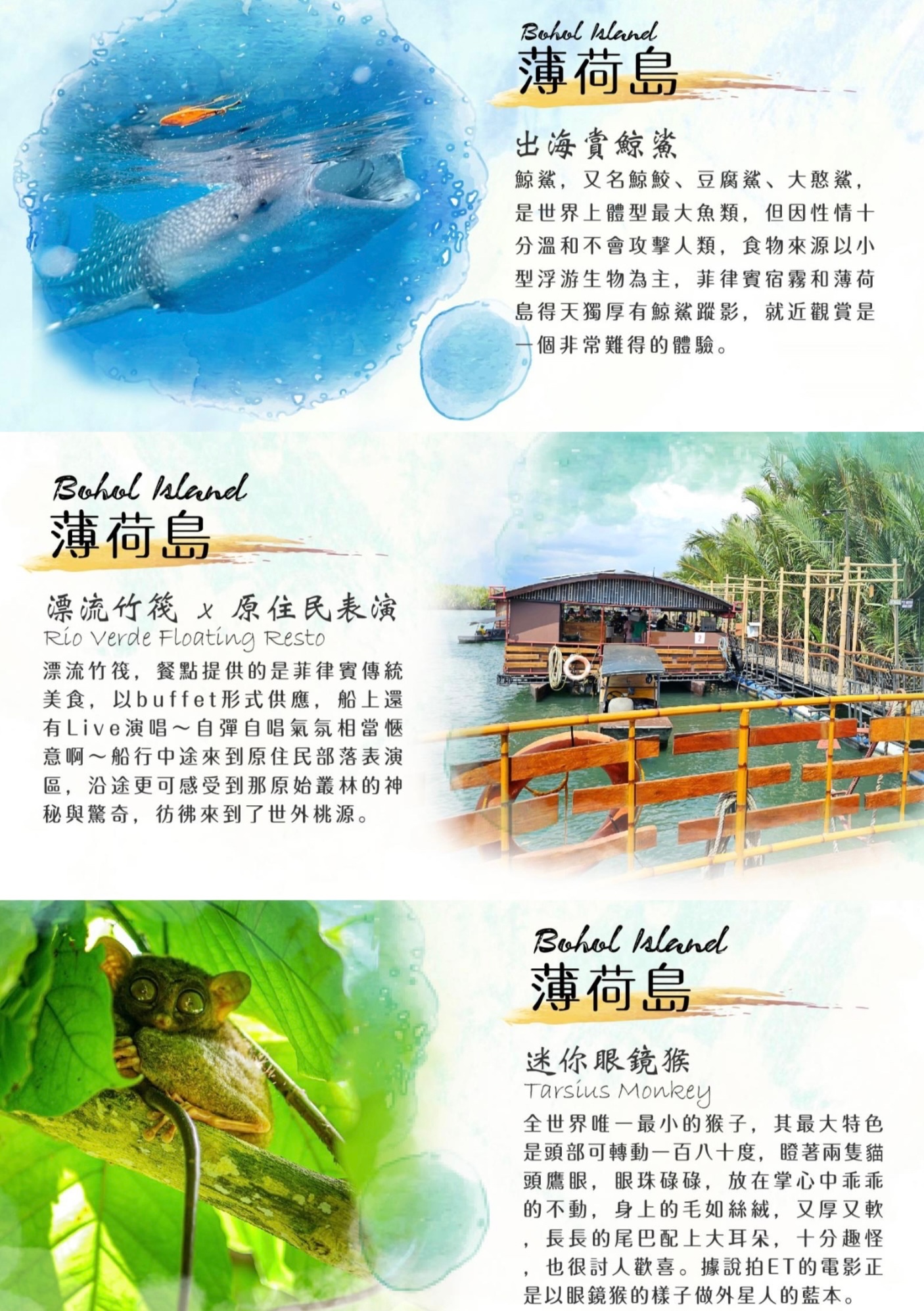 早餐後,隨即展開當地的文化之旅來認識Bohol,搭車前往參觀全世界最小的猴子【眼鏡猴 Tarsius Monkey】眼鏡猴最大的特色為頭部可180度轉動,身體小小的但眼睛卻又大又圓,身上 的毛如絨絲,又軟又厚,十分逗趣也十分討人歡喜。隨後驅車前往巧克力山丘參觀,途經薄荷島 上唯一的原始叢林區;【巧克力山Chocolate Hill】是由1268個大小山丘所組成的,每一座高度 為40~120公尺,都是圓錐體,地質屬石灰岩地型,從登高處望下,會因時節不同而多有變化, 時而翠綠,時而火紅,又時而昏暗,會讓您嘆為觀止,目前為世界十大奇景之一。您亦可挑戰一下自己的體能,登上數百個階梯的【比翼雙飛觀景坪】, 由高處俯瞰整個巧克力山的美景,更讓 您有心曠神怡的舒適感。 隨後安排搭乘【漂流竹筏船屋】遊覽兩岸翠綠之風景,乘著船屋,一邊品嚐菲式午餐和享受徐徐 清風、綠水及欣賞兩岸原始叢林。 餐後稍作休息隨即搭乘船隻返回宿霧。