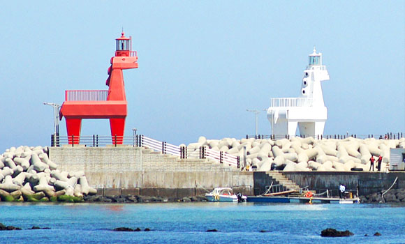 【梨湖海水浴場(紅白馬燈塔)】是最靠近濟州市區的海水浴場,交通方便且設備完善,沙灘坡度不高相對安全。夏天有許多避暑的訪客,海邊還有一片松樹林,適合野營也是它的另一個魅力。這裡的夜景也十分出名,所以就算是在晚間也有許多遊客。