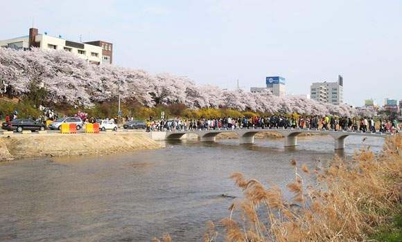 【無心川櫻花】無心川貫穿整個清州市中心,將清州分成上黨區和興德區,河流全長約33.5公里,是錦江的支流。三月底到五月的春季,在美麗的無心川河旁邊道路及休閒散步道路--無心川櫻花路被櫻花綻放成白茫茫的一片,一旁還有粉黃色的迎春花,吸引許多情侶和遊客前往。