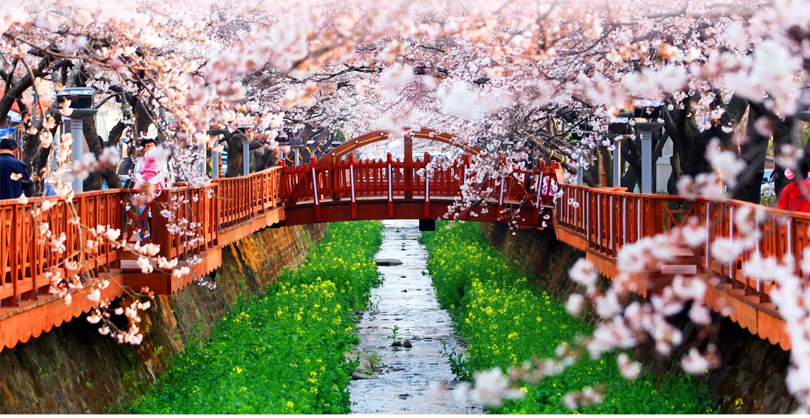【余佐川(賞櫻)】曾是MBC電視臺戲劇《羅曼史》主要拍攝取景地,以身為鎮海賞櫻聖地為名,劇中兩位主角在參觀完鎮海軍港祭後於余佐川的橋座上初次相遇。每逢4月份春季時節,櫻花開滿遍布於整座城市,這也是鎮海被推選為最美麗的賞櫻地區主要原因,從各地遠道而來賞花的遊客歡歡喜洗聚集在櫻花樹下郊遊野餐的景象,也成為這裡更加亮眼的一道風景。