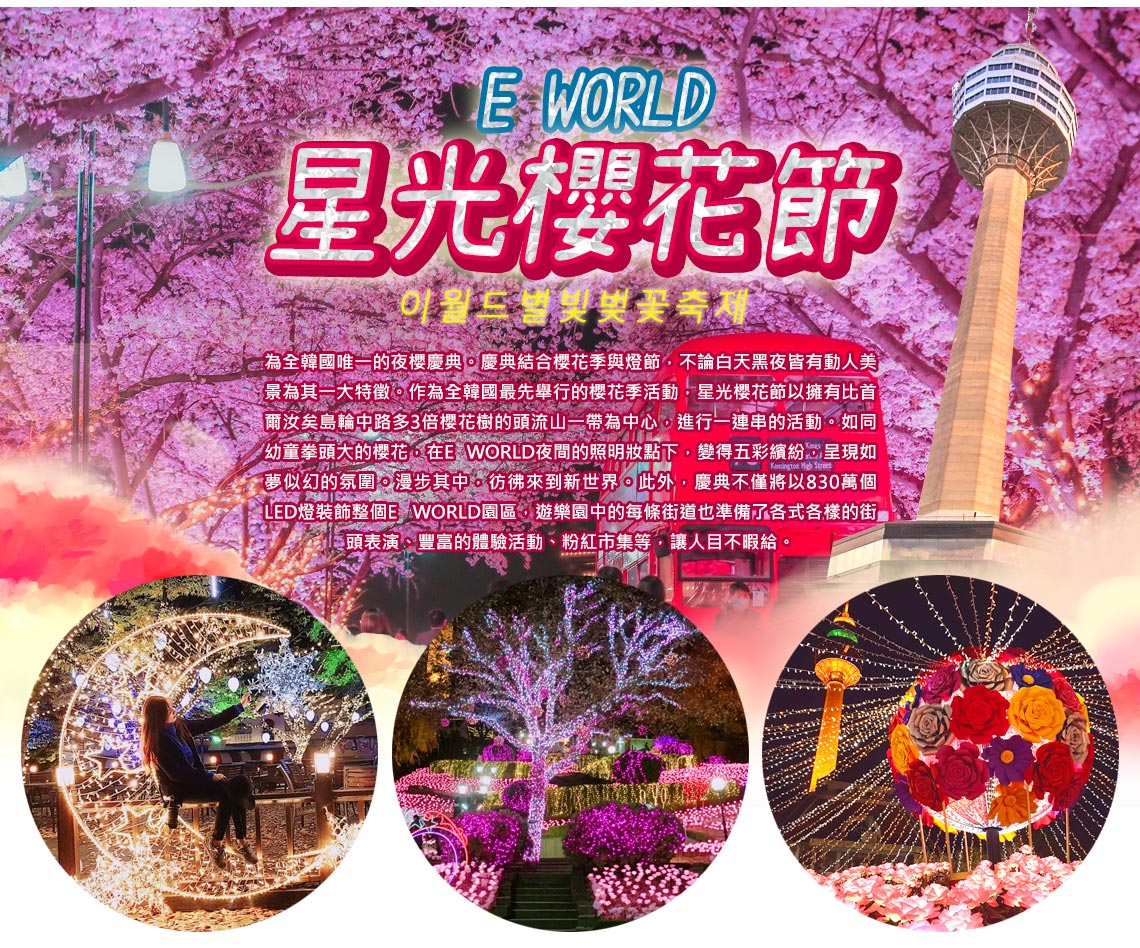 【E WORLD星光櫻花節】為全韓國唯一的夜櫻慶典,呈現如夢似幻的氛圍。漫步其中,彷彿來到新世界。慶典不僅將以830萬個LED燈裝飾整個E WORLD園區,遊樂園中的每條街道也準備了各式各樣的街頭表演、豐富的體驗活動、粉紅市集等,讓人目不暇給。