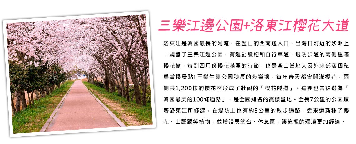 【三樂江邊公園+洛東江櫻花大道】三樂生態公園狹長的步道邊,每年春天都會開滿櫻花,兩側共1,200棟的櫻花林形成了壯觀的「櫻花隧道」。這裡也曾被選為「韓國最美的100條道路」,是全國知名的賞櫻聖地。全長7公里的公園順著洛東江所修建,在堤防上也有約5公里的散步道路。近來還新種了櫻花、山躑躅等植物,並增設展望台、休息區,讓這裡的環境更加舒適。