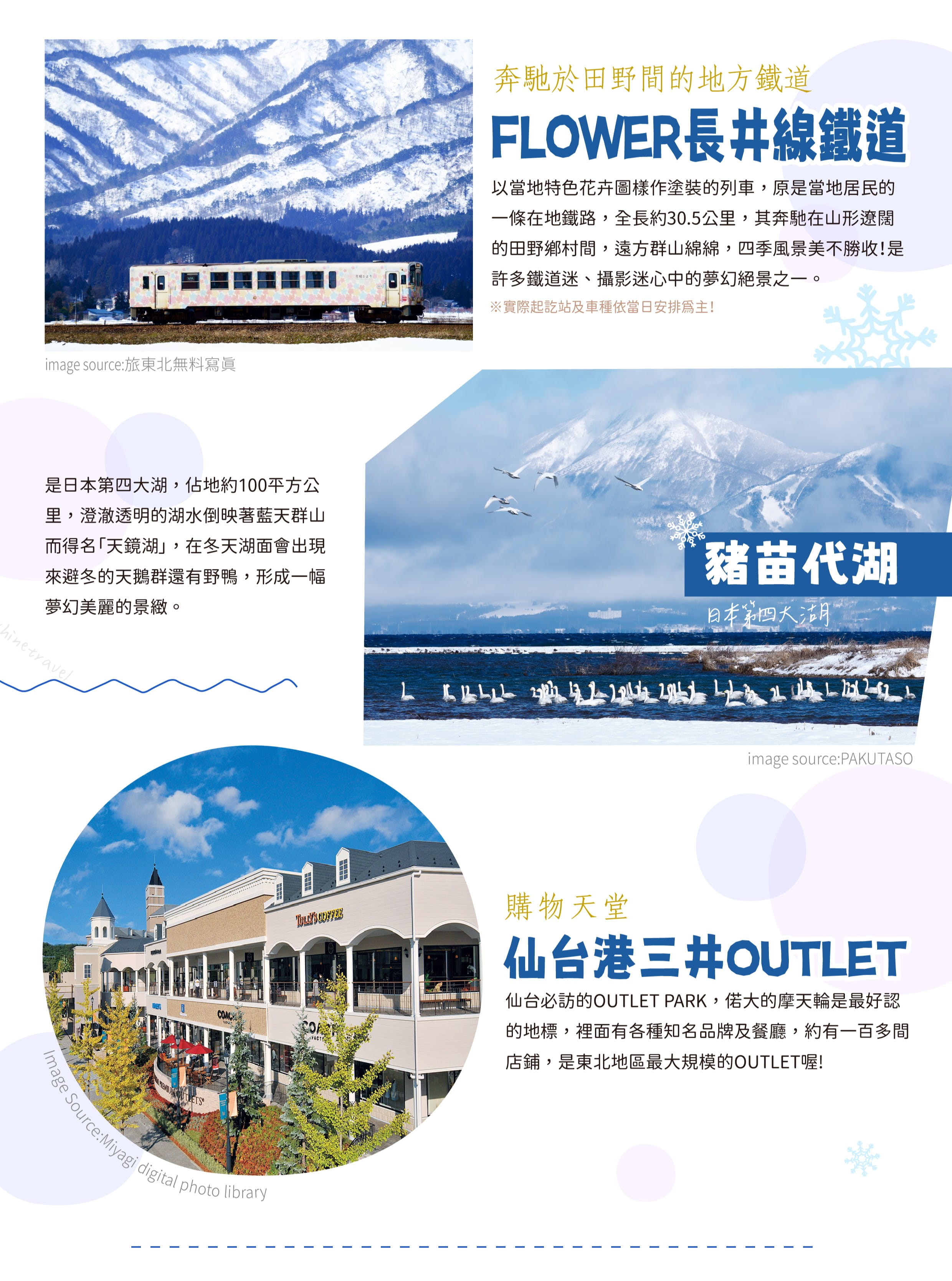 【山形鐵道FLOWER長井線】從火車的窗外可沿途欣賞四周的稻田和四面八方的山脈。由於線路遍 布著千年以上的經典櫻花、鳶尾花、大麗花、百合花、玫瑰花、紅花等花卉名勝,因而得名「FLOWER 長井線」。尤其是長井站至荒砥站之間的建築很少,一片山野的田園風光鋪展開來,冬季雪景遼闊, 春季櫻花燦爛,展現日本原鄉風貌,博得人氣。