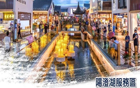 【園林式主題陽澄湖服務區】總建築面積達5萬平方米是目前中國體量最大的高速公路服務區之一。 遠遠望去,服務區外立面採用水墨畫抽象線條,大型水景和白牆黛瓦的人字坡天際線,營造出水鄉夢 境。門前一塊大石頭上寫著“最美園林文化服務區”。
