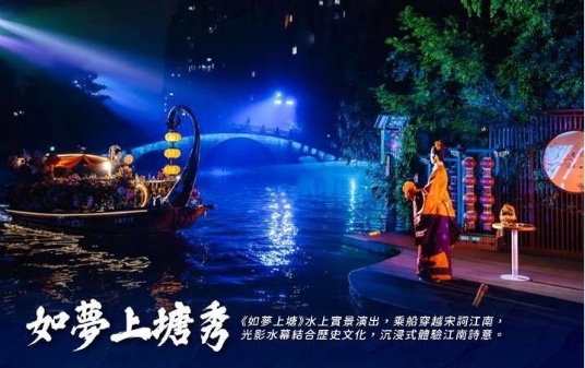 【如夢上塘秀】是大型宋詞文化主題水上實景演出。演出提取五代至南宋九位詞人的故事,演出時長 約60分鐘,八大篇章,十大場景,由國內知名藝術團隊傾情打造和演繹。演出採用全新“行進+沉 浸”式觀演模式,並將戲劇、電影、水幕、光影、裝置等藝術巧妙地融於一體,帶來真人實景與水幕 光影相結合的視覺盛宴,讓觀者感受“人在船中坐,船在畫中游”的別樣體驗。