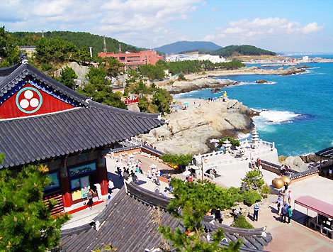 【海東龍宮寺】主奉觀音菩薩,與襄陽洛山寺、南海菩提庵並列韓國三大觀音聖地,最初稱為普門寺,1974年後因住持夢見白衣觀音乘龍升天,便將寺廟名稱更名為《龍宮寺》。此寺廟信徒眾多,人聲鼎沸與浪濤拍打崖邊,激起陣陣的雪白浪花相互輝映,十分壯觀,此時,不妨入境隨俗,在祈願瓦片上寫上自己的願望,保佑心想事成,據說相當靈驗。