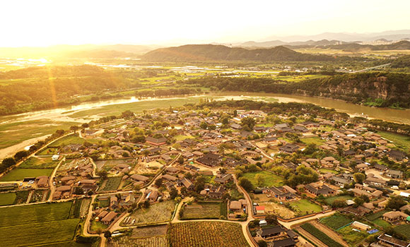 【安東河回村】是韓國家喻戶曉的民俗村,三面被洛東江包圍,因而取名爲「河回」,意義是河流在此迴繞,也有人稱其爲「水環洞」。這裡不是人工形成的村莊,迄今都有人在此居住。
