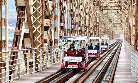 【金海洛東江鐵道自行車】全程來回約3公里,是穿越鐵橋,能飽覽洛東江景色的休閒運動。不僅能感受踩著鐵路自行車行經復古鐵橋的特別體驗,還可與附近的紅酒洞窟一併遊覽,更添樂趣。