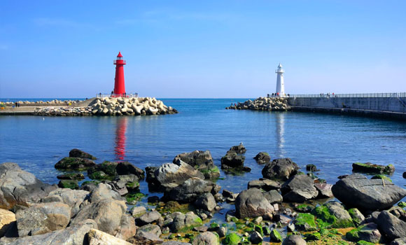 【青沙浦紅白燈塔】而觀景臺正前方至青沙浦燈塔整齊並排的5個暗礁、青沙浦秀麗的海岸景觀,以及夢幻的日出、夕陽美景,是這裡最不容錯過的景色。青沙浦燈塔--青沙蒲港的海岸旁豎立了兩個燈塔一個乳白色一個是紅色相互輝映,寧靜海港被落日斜輝映照得一片橙紅,兩個燈塔的倒影在水中輕輕盪漾,意境優美,也就是因為如此的美景才會一直成為韓劇及廣告的拍攝地。