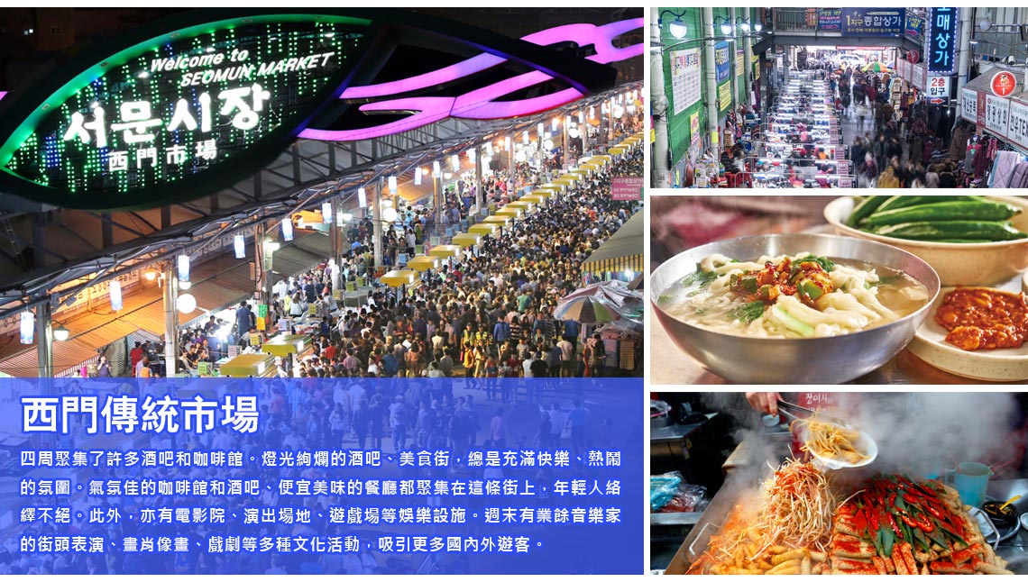 【西門傳統市場】四周聚集了許多酒吧和咖啡館。燈光絢爛的酒吧、美食街,總是充滿快樂、熱鬧的氛圍。氣氛佳的咖啡館和酒吧、便宜美味的餐廳都聚集在這條街上,年輕人絡繹不絕。此外,亦有電影院、演出場地、遊戲場等娛樂設施。週末有業餘音樂家的街頭表演、畫肖像畫、戲劇等多種文化活動,吸引更多國內外遊客。