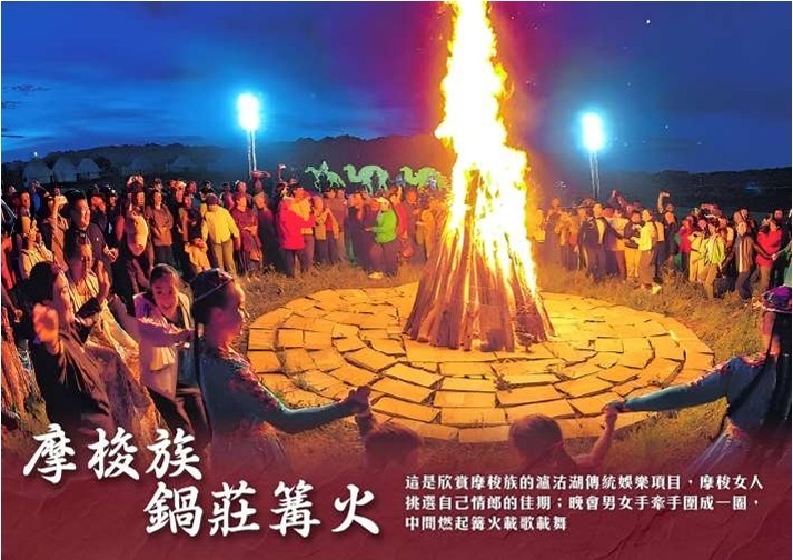 【摩梭族鍋莊篝火晚會】這是欣賞摩梭族的瀘沽湖傳統娛樂項目,摩梭女人挑選自己情郎的佳期;晚 會男女手牽手圍成一圈,中間燃起篝火載歌載舞,姑娘們穿戴整齊,所有飾品都戴在身,頭纏黑布大 包頭,身穿白色百褶裙,高聲歌唱對情歌,再端上一碗“蘇理瑪”酒,要情郎當眾誓言忠誠。