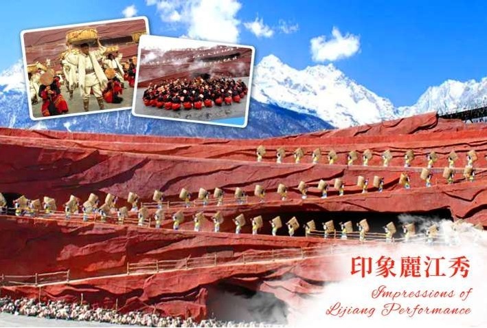 【印象麗江秀】印象麗江是由名導演張藝謀執導的大型實景演出,在玉龍雪山下的舞臺上以原生態形 式向觀眾展示麗江10個少數民族的生活。