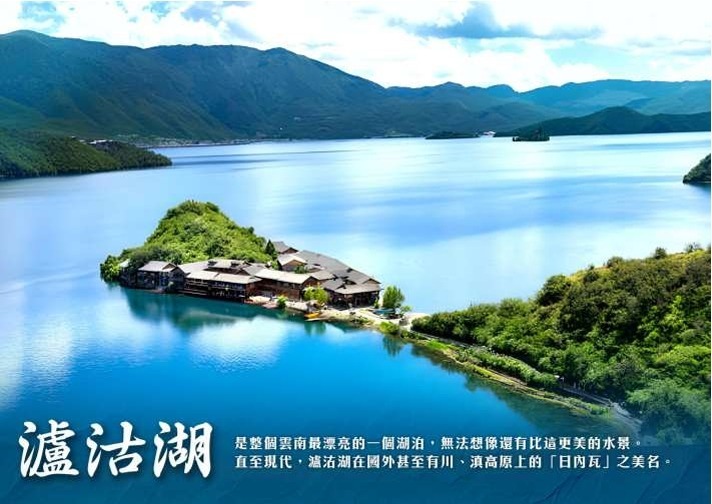 【瀘沽湖】海拔2685米是雲南省最高的湖泊,高原獨有的蔚藍天空襯著湛藍的湖水,幾座秀麗的小島 散落湖中,緩緩滑行于碧波之上的豬槽船和徐徐飄浮幹水天之間的靡梭民歌,更添其風情,瀘沽湖以其 獨特的摩梭風情和秀麗的山水風光聞名於世,住在這裡的摩梭人是中國唯一仍存在的母系氏族社會,實 行“男不娶、女不嫁”的“走婚”制度,被人們稱之為「神秘的女兒國」。