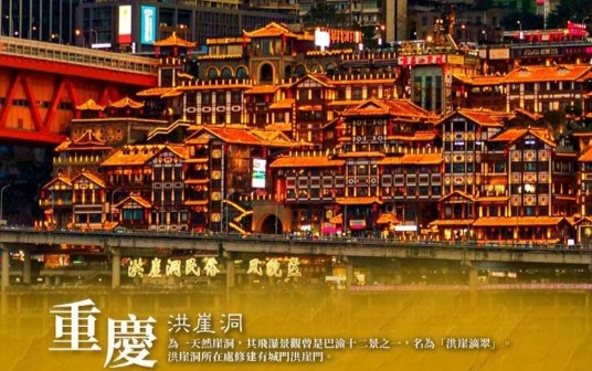 【洪崖洞】網紅打卡地,洪崖洞位於重慶市渝中區滄白路,長江、嘉陵江兩江交彙的濱江地帶,以具有巴 渝傳統建築特色的“吊腳樓”風貌為主體,依山就勢,沿江而建,是逛山城老街、觀賞兩江風光、品嚐當 地美食的好去處。
