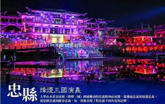 18:30-22:00 上岸觀看贈送【烽煙三國大型實景演出】中國首部以歷史為背景、以戰爭為題材的大型山水 實景演出,該劇演出以長江三峽為背景,以三峽港灣為舞臺,以三國文化為主題,以忠義精神為靈魂,以 歌舞、雜技、馬術等多種表演形式,生動展示桃園三結義、火燒赤壁、單刀赴會等三國歷史的多個真實場 景。通過全息投影、可移動觀眾席和超大的水域舞臺等技術和設備,以真人、真馬的方式再現了三國時期 一些重大戰役和事件。演出規模宏大,場面震撼,為觀眾帶來一場視覺盛宴。