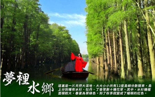 【夢裡水鄉】龐大的水利資源使得這裏成為一片天然大濕地,濕地中大大小小共有12座島嶼分散開來, 島上分別種有水杉、牡丹、丁香、桃花、紫薇、玫瑰等數十種花草,它們可在不同季節呈現出不同美的美 景。其中,水杉種植面積較大,一棵棵高聳入雲、清秀挺拔,春夏為翠綠色,而到了秋季就變成了耀眼的 紅色,光彩奪目,吸引眼球。