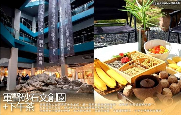 【軍聲砂石文創園】展覽區展示了眾多砂石畫藝術精品,這些作品以砂石、植物等自然材料為繪畫創 作原材料,創造出了一種全新的繪畫種類--砂石畫。在這裡,您將欣賞到各種獨特的砂石畫作品,感受 藝術的魅力與自然的和諧之美。並在此安排品嚐下午茶+小點。